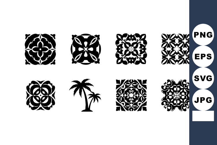 Vector image displays eight black ornamental tile patterns and a palm tree silhouette in a clean style, suitable for design projects with classic and tropical themes, elegant mood.