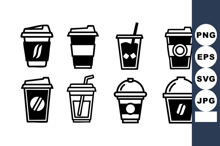 This vector file features a variety of coffee cup icons including takeaway hot cups, cold cups with straws, and lids in black and white style, perfect for beverage branding or cafe menus. Clean and simple design.
