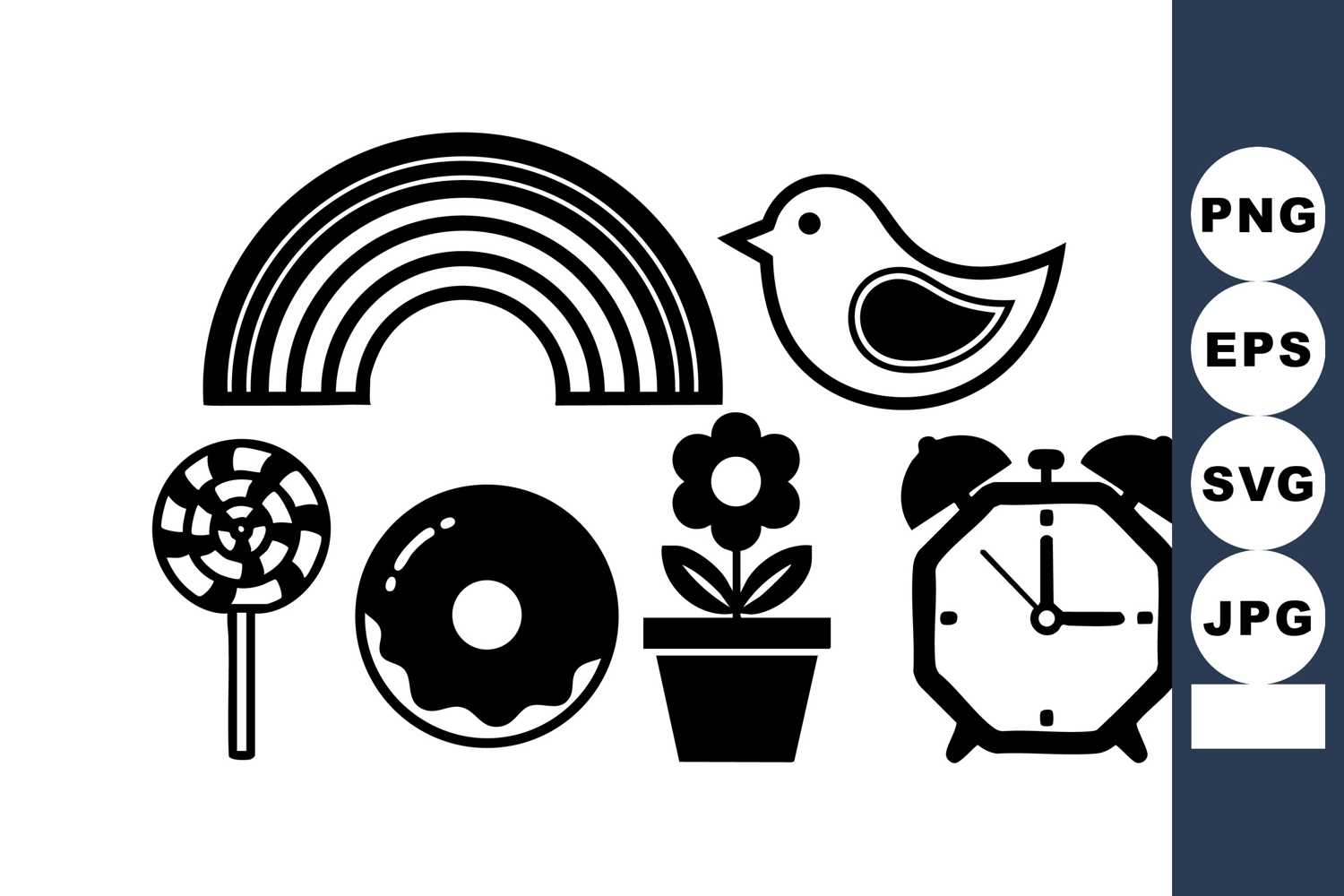 This vector features simple black icons including a rainbow, bird, flower in pot, lollipop, donut, and alarm clock. The clean style conveys playful and cheerful mood.