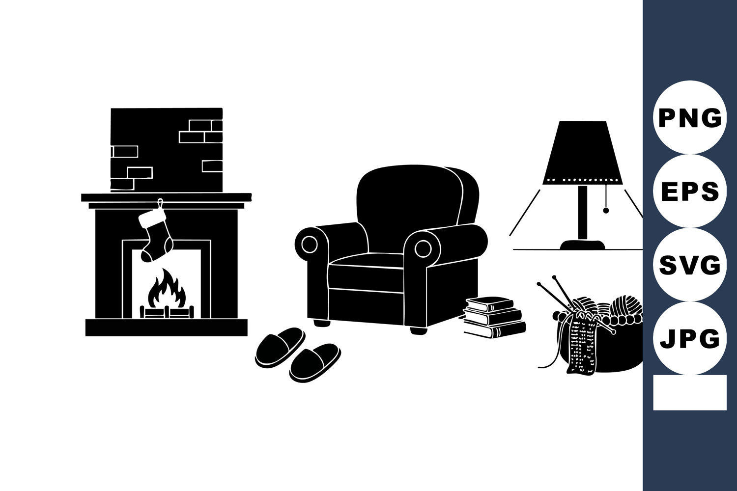 Black and white vector illustration showing a cozy living room with an armchair fireplace lamp slippers firewood and a knitting basket creating a warm inviting mood
