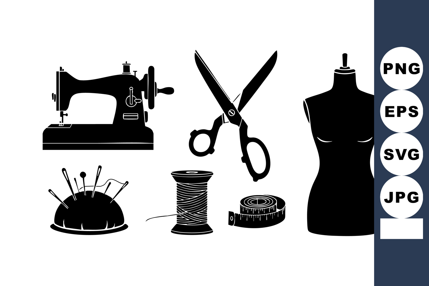 Vintage Sewing Machine Black Silhouette Style Sewing Machine Scissors Scissors Mannequin Pincushion Mannequin Pincushion Thread Pincushion Thread Measuring Thread Measuring Tape Creative Craftsmanship Mood Tailor Workshop Equipment Handmade Textile Design