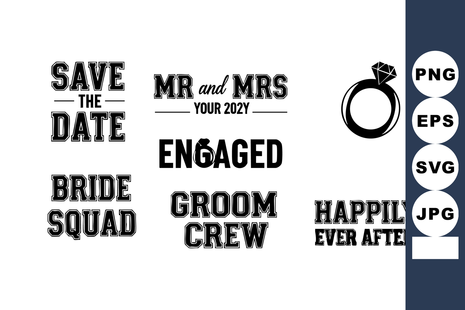 Save The Date Wedding Invitation Vector Diamond Engagement Ring Bride Squad Groom Groom Crew Engaged Wedding Ring Happily Ever After Wedding Love And Commitment Romantic Mood Design Bold Black Style