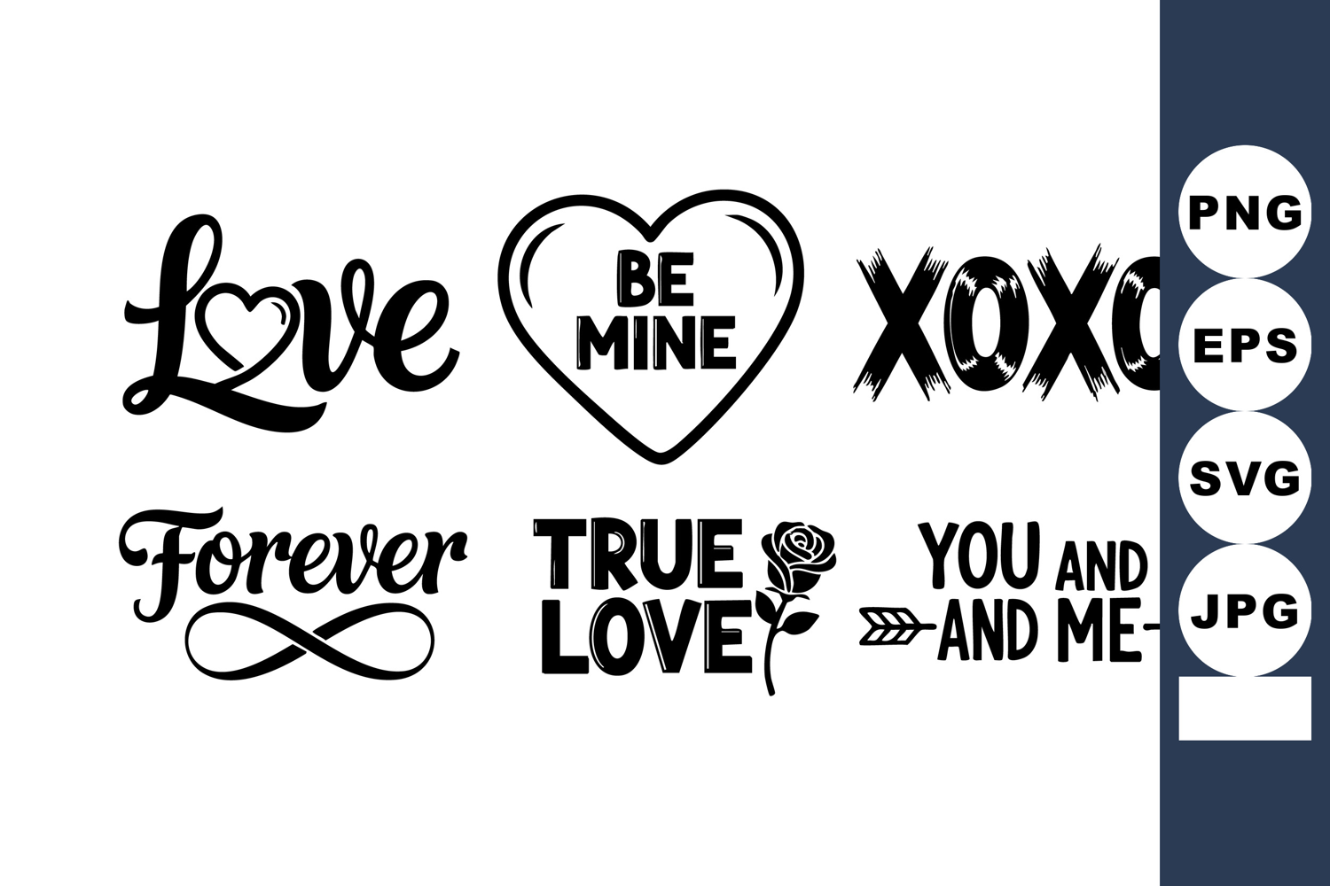 This vector file features romantic love texts including love with heart, be mine in heart, xoxo, forever with infinity, true love with rose, and you and me arrow. Romantic mood.
