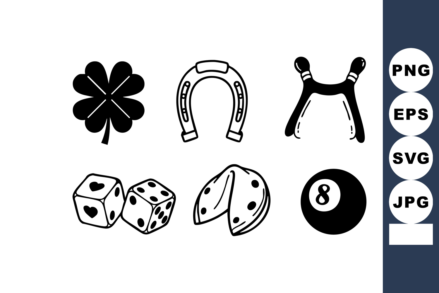 Black silhouette icons of lucky symbols including clover, horseshoe, dice, fortune cookie, and pool ball presented in simple vector style, evoking chance and luck mood.
