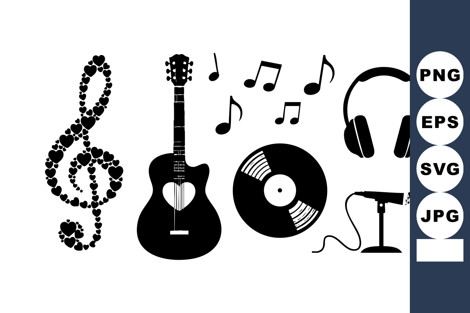 Vector illustration showing music symbols including a treble clef, acoustic guitar, vinyl record, headphones, microphone, and musical notes in black silhouette style, creative mood.