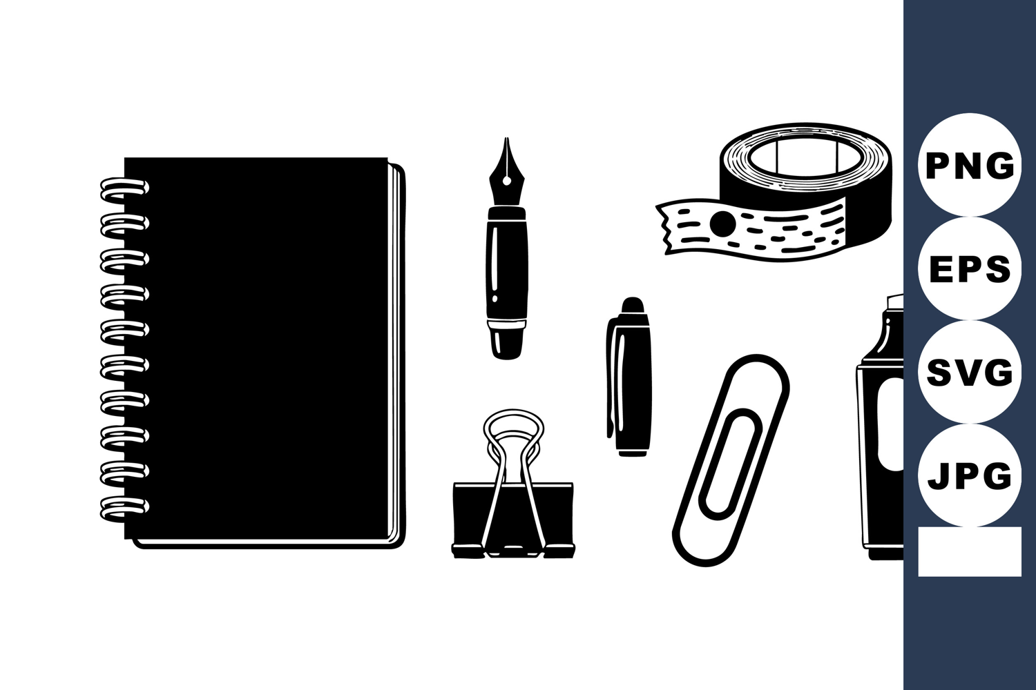 Black White Vector Office Supplies Set Notebook Pen Marker Paperclip Adhesive Tape Binder Clip Vector Vector Illustration Office Essential Office Supplies Minimal Style Calm Writing Paper Tool Work Desk School
