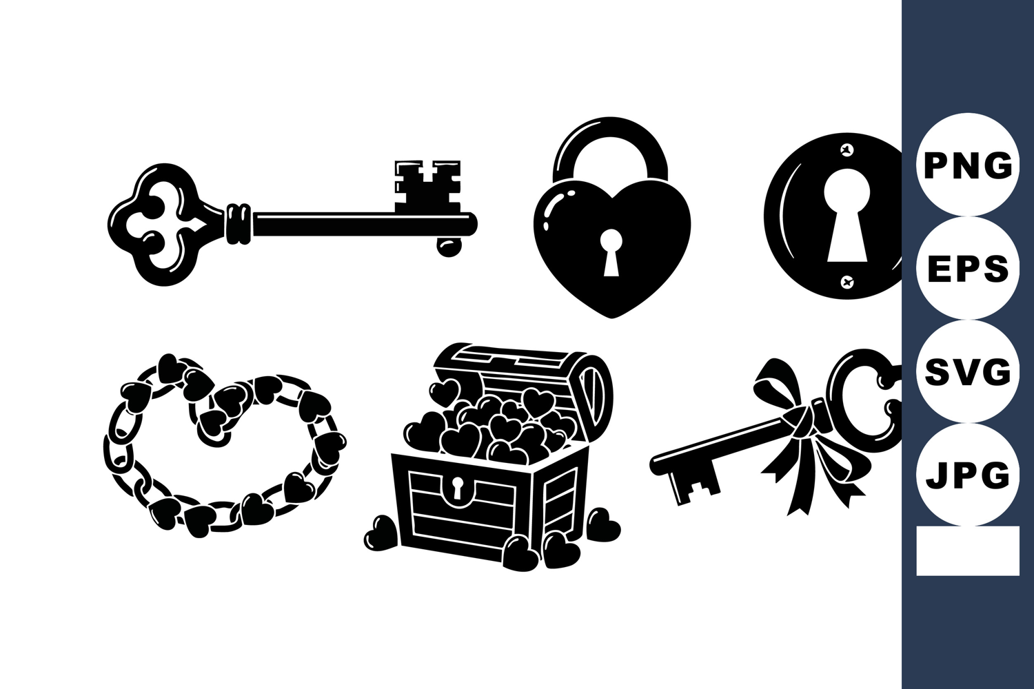 Vintage Keys Collection Lock Heart Shaped Treasure Chest Coins Chain Black Silhouette Classic Antique Themes Elegant Vintage Design Keyhole Lock Icon Old Metal Keys Security Lock Symbol Black Vintage Icons