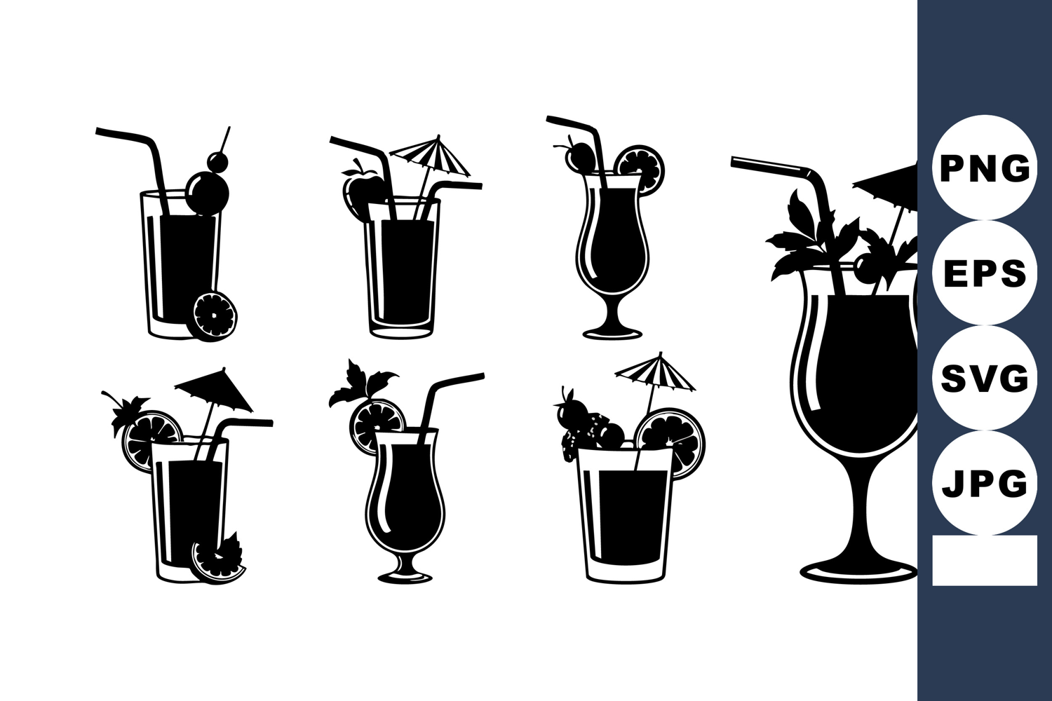 Summer Party Drinks Black Silhouette Vector Cocktail Drinks Set Fruit Slices Illustration Drinks With Straws Tropical Cocktail Glass Refreshing Beverage Design Cocktail Umbrella Decoration Exotic Fruit Garnish Cool Cocktail Party
