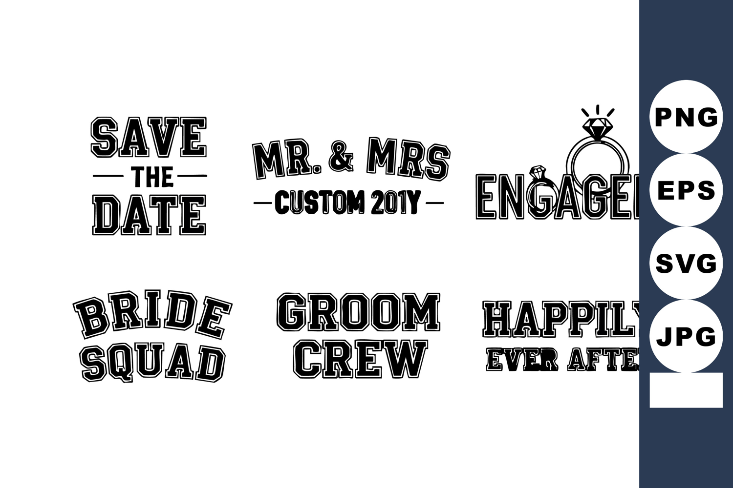 This vector illustration features vintage style wedding and engagement text phrases including save the date mr and mrs bride squad groom crew happily ever after in black typography. Romantic mood.