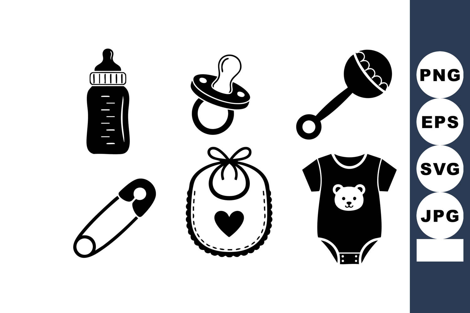 Vector illustration showing six black baby accessories including bottle, pacifier, rattle, safety pin, bib with heart, and onesie with bear design in simple style, playful mood.