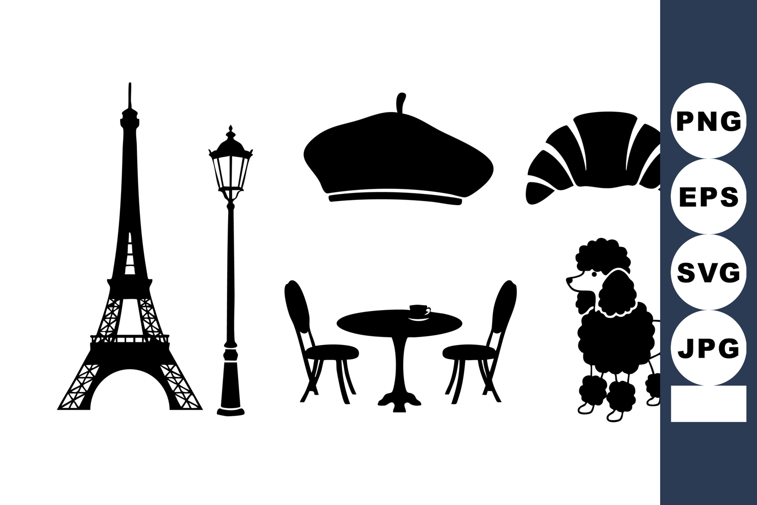 Eiffel Tower Paris Dog Silhouette Vector Black Silhouette Vector Paris Street Lamp Beret Croissant Cafe Table Chairs Poodle Simple Flat Style Clean Lines Contrast Vintage Classic Design French Culture Europe