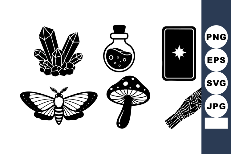 Set of magical witchcraft symbols including crystal cluster potion bottle mushroom moth tarot card and smudge stick shown in black silhouette style mystical mood.
