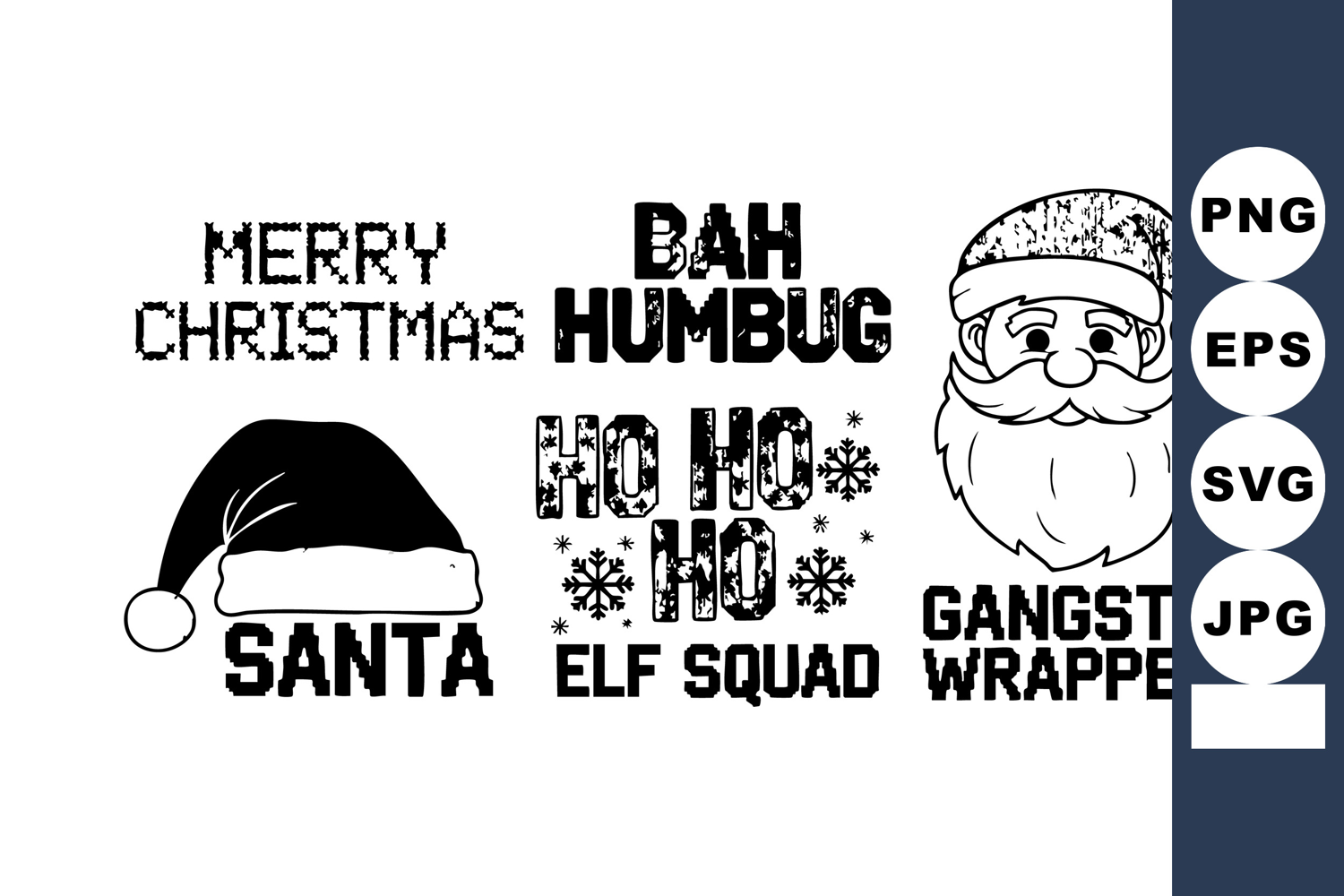 This black and white vector set features a santa hat santa claus beard and festive holiday text phrases including merry christmas bah humbug ho ho ho elf squad and gangsta wrapper creating a playful seasonal mood