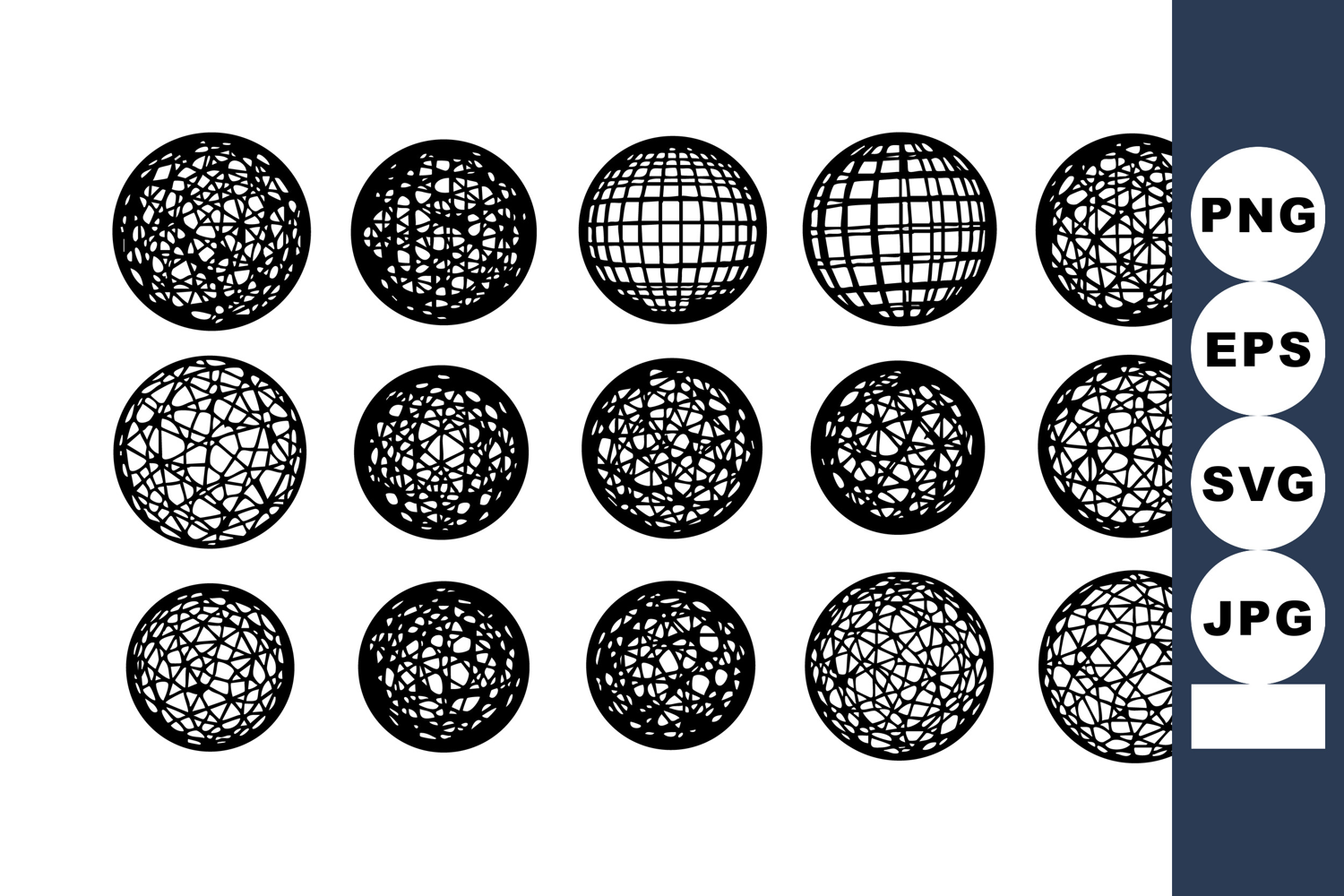 Illustration features fifteen unique spherical wireframe shapes with geometric and mesh patterns in black and white style. The design is minimalistic and modern. Creative mood.