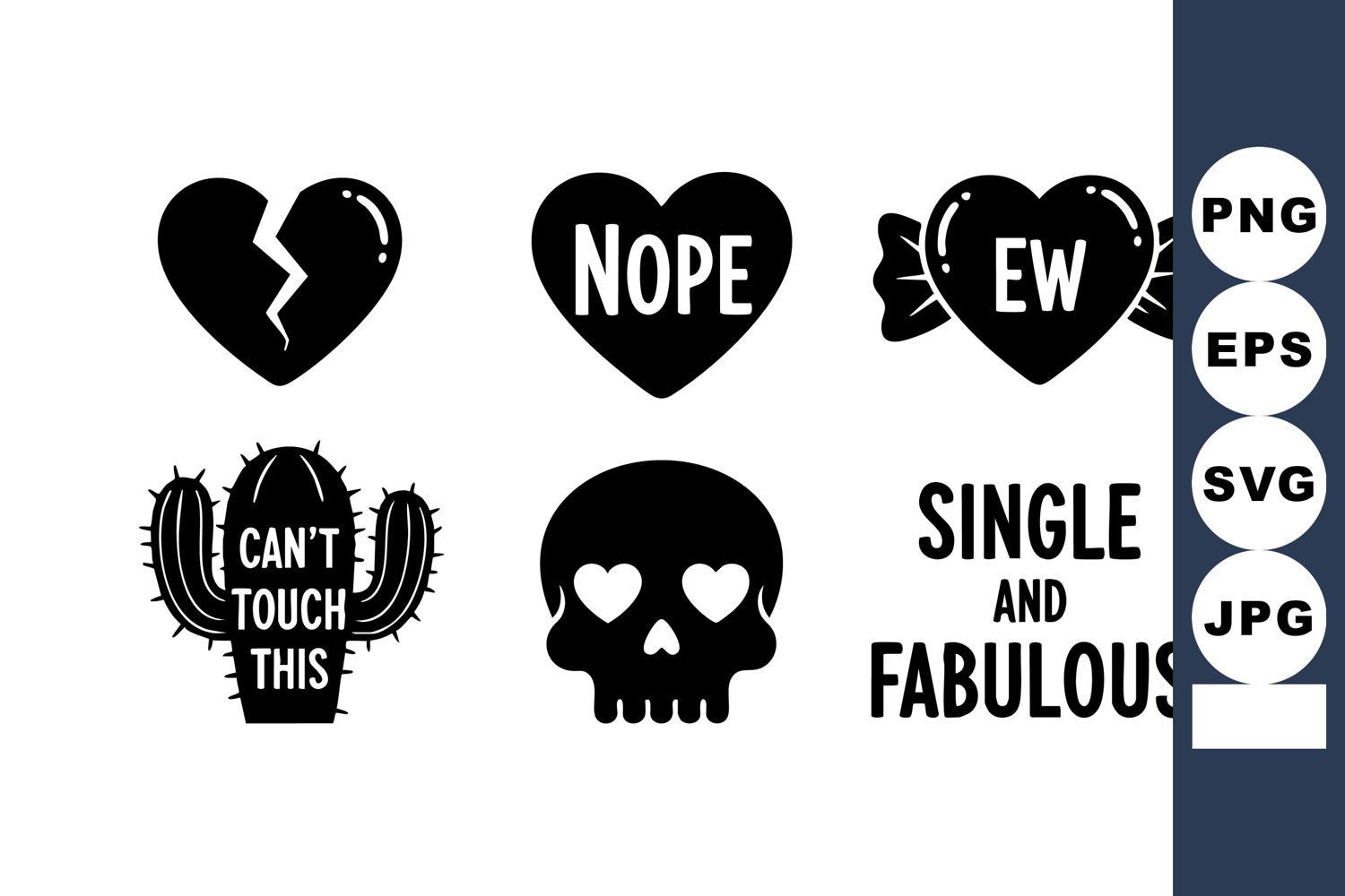 This vector illustration features icons including a broken heart, nope heart, ew candy, cactus with text, skull with heart eyes, and a phrase single and fabulous. Playful mood.