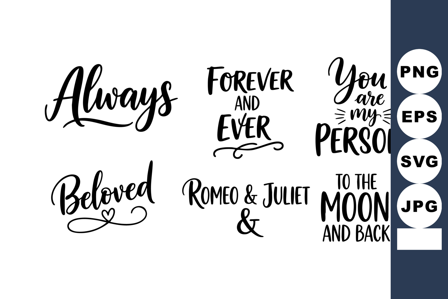 This vector illustration features romantic calligraphy quotes including phrases like always beloved and to the moon and back in a handwritten style for a loving mood.