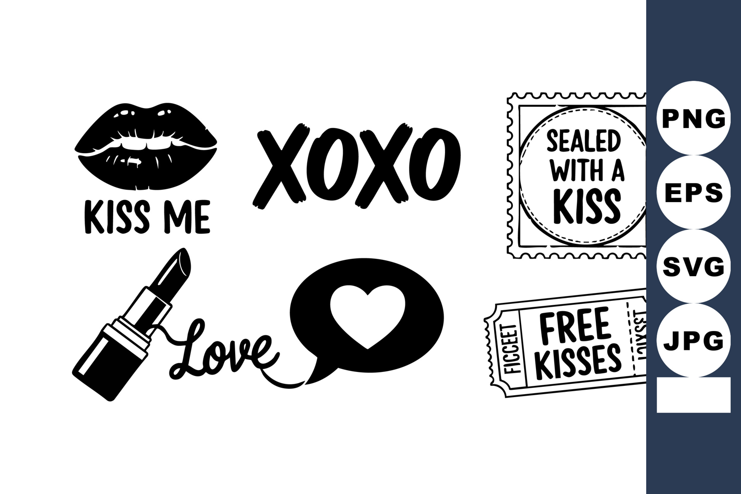 Black and white vector illustration of kiss lips, xoxo text, love speech bubble, lipstick, sealed with kiss stamp, and free kisses ticket with romantic theme and playful mood.