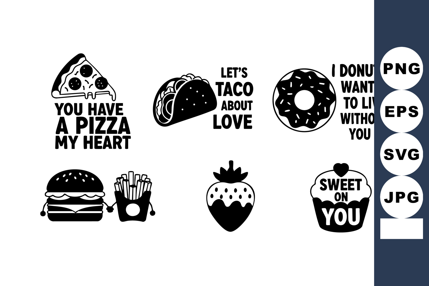 Black White Vector Pizza Pun Icon Taco Love Icon Donut Heart Phrase Burger Fries Icon Strawberry Sweet Love Cupcake Romantic Phrase Food Pun Icons Playful Food Icons Cheerful Love Theme