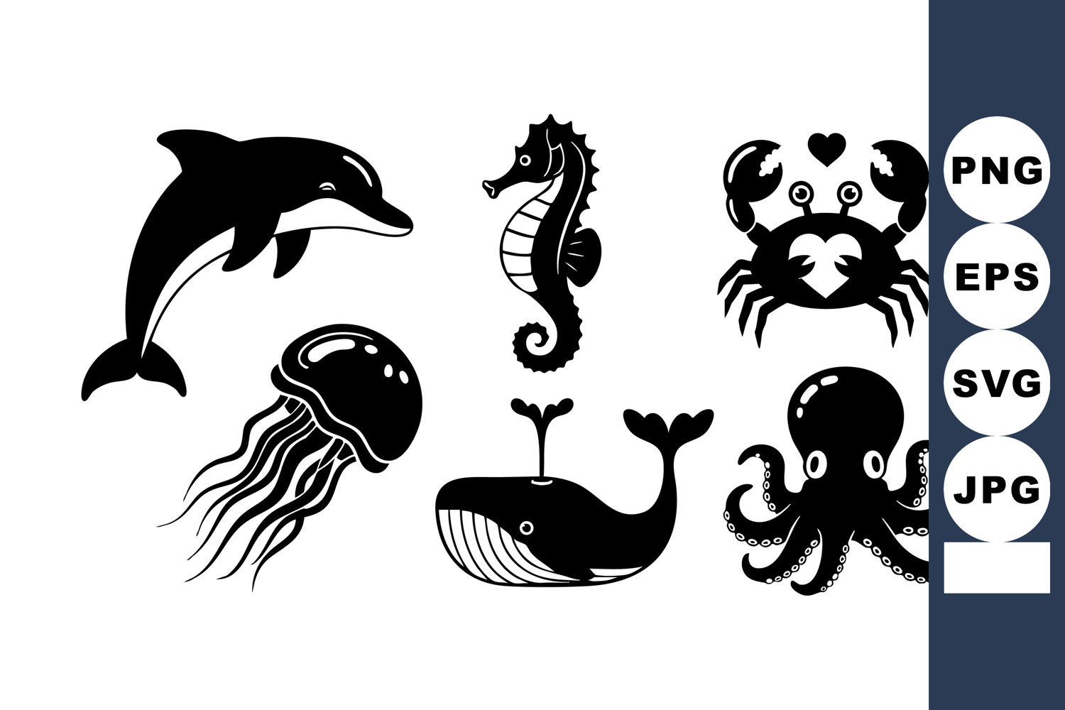 This vector illustration shows six black silhouette marine animals including dolphin seahorse crab jellyfish whale and octopus in a simple style with clear shapes calm mood