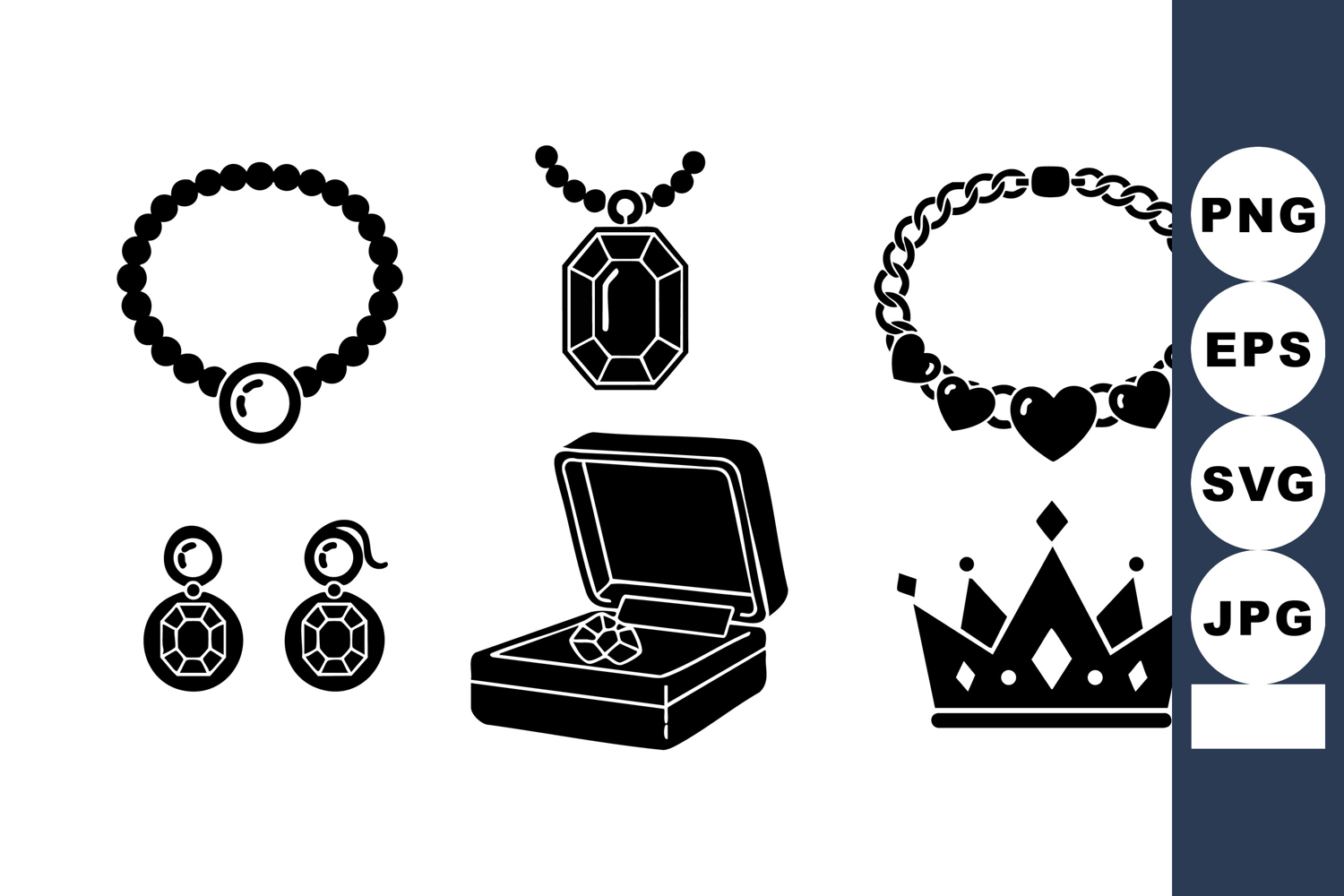 The vector shows black silhouette jewelry including bracelets necklaces earrings a ring in a box and a crown design presenting luxury and elegance in a simple style artistic