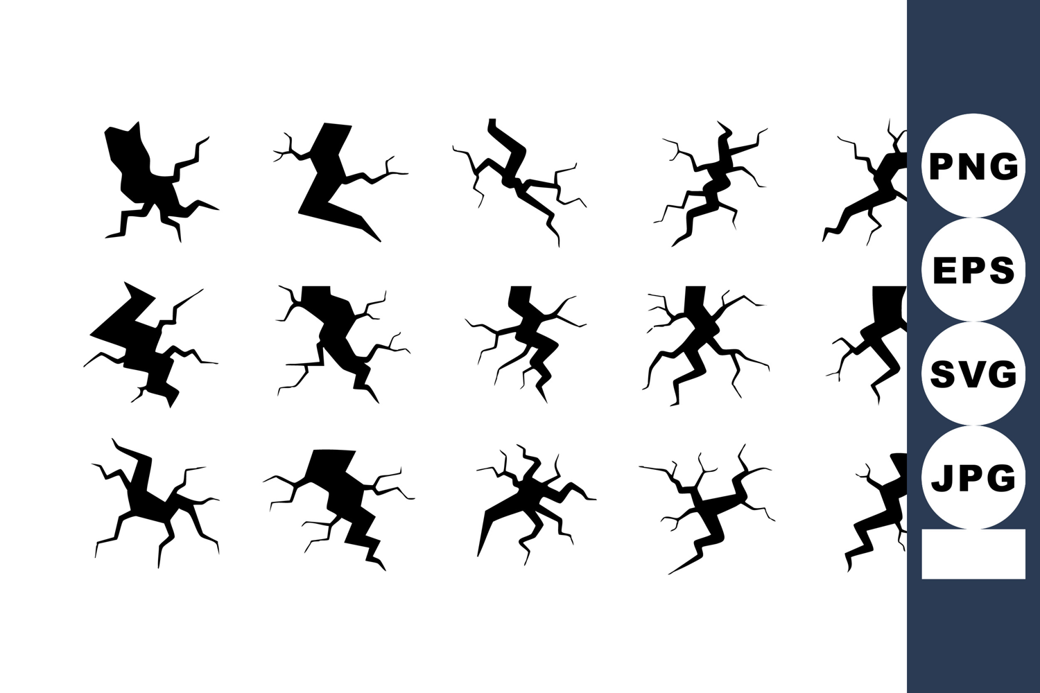 This image shows sixteen black cracked ground hole shapes as vector illustrations featuring natural fracture designs in various forms arranged in a grid pattern. Simple and bold style creates a striking visual effect.
