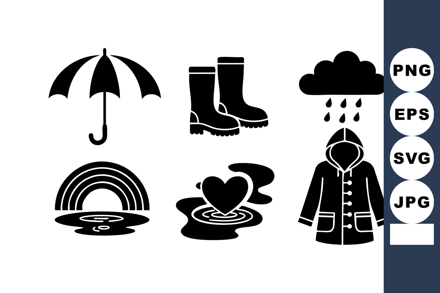 Black Silhouette Style Simple Clear Mood Weather Protection Icons Umbrella Boots Raincoat Rain Cloud Rainbow Heart Splash Vector Weather Safety Equipment Rainy Day Icons Outdoor Weather Gear Storm Protection Clothing