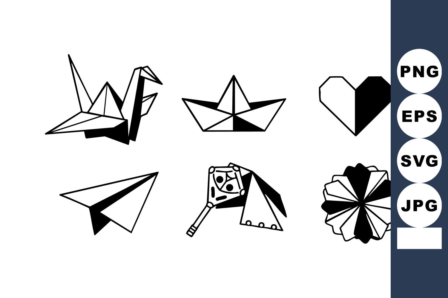 This image shows six black and white origami paper figures including a crane, boat, heart, plane, fan, and butterfly arranged in two rows creating a minimalist artistic design with sharp lines. The style is clean and simple with a monochrome palette creating a modern mood.