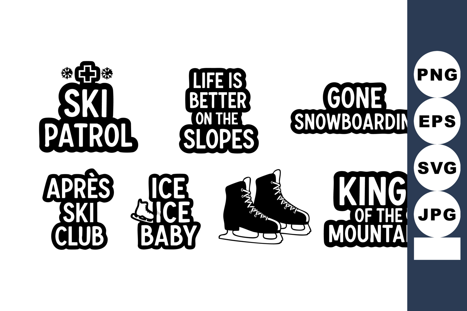 This vector illustration features winter sports themed quotes and icons including ski patrol, snowboarding, apres ski club, ice skates, and mountain slogans in bold black style. Energetic mood.