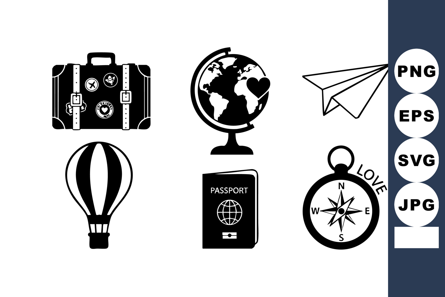 Hot Air Balloon Travel Icons Vector Black White Simple Suitcase Globe Paper Paper Plane Balloon Passport Compass Love Simple Design Calm Travel Journey Trip Explore Adventure Vacation Holiday Tourism Navigation