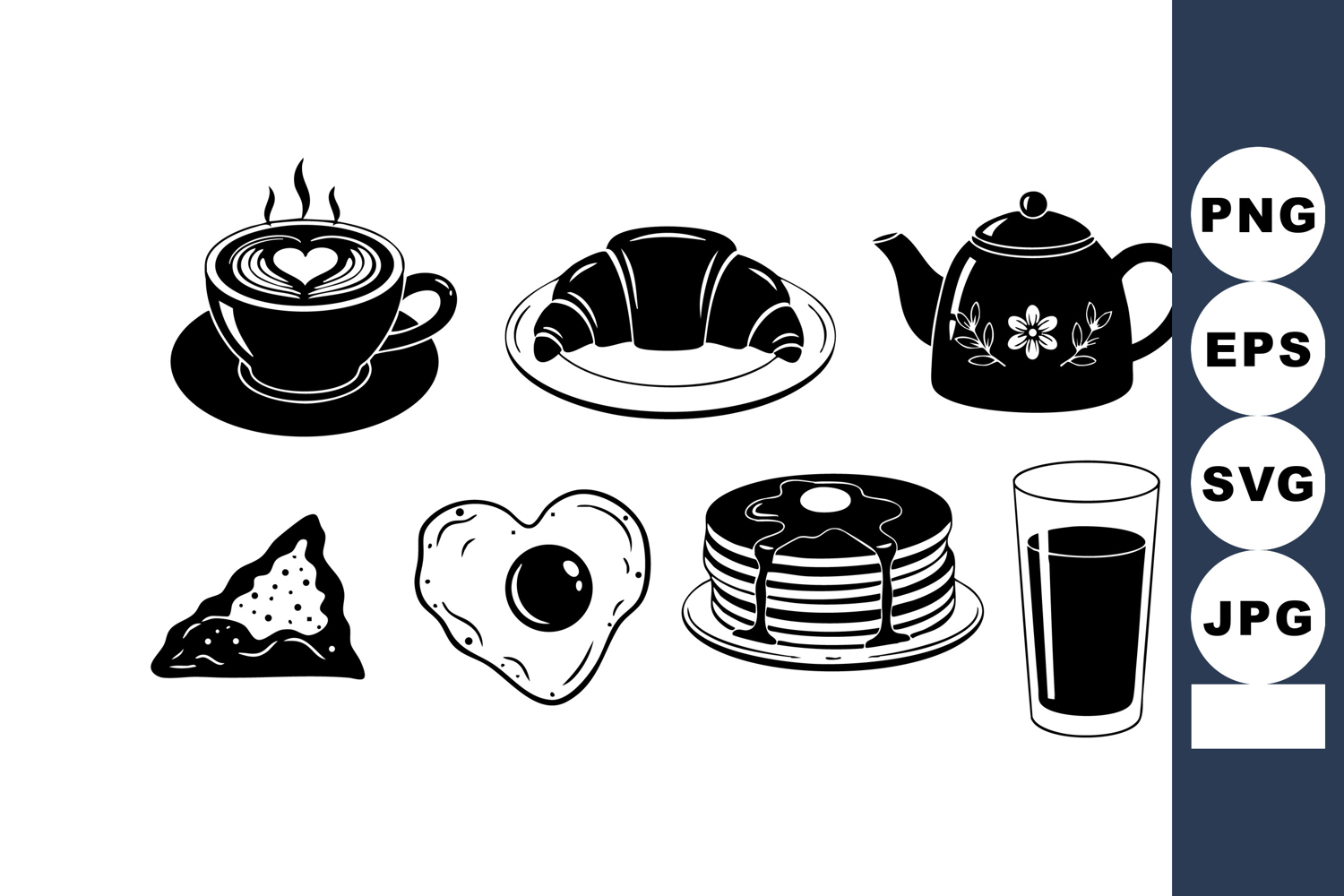 This vector illustration shows a black silhouette breakfast set including coffee cup, croissant, teapot, scone, fried egg, pancakes, and glass of juice in a clean style. Calm mood.