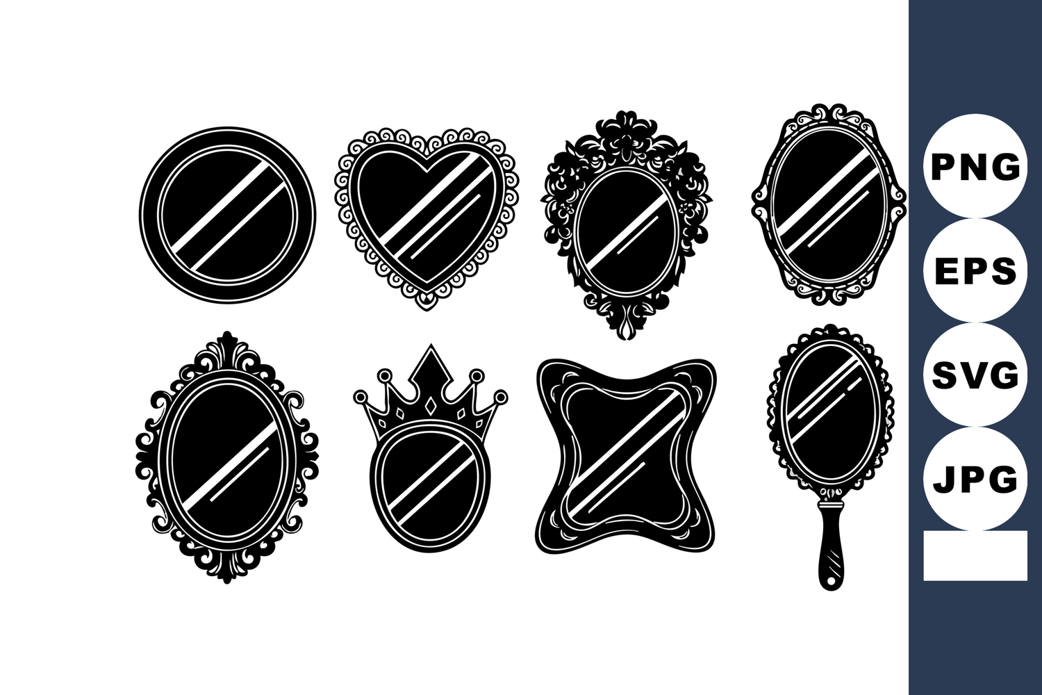 This vector illustration shows a set of eight vintage ornate decorative mirrors with various frame shapes and styles including round heart star and crowned designs in black silhouette elegant