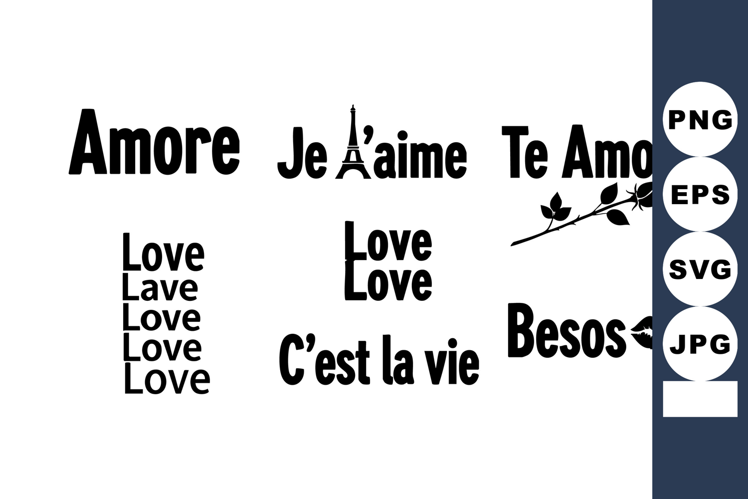 This vector illustration features various love related words in different languages along with a kiss symbol and a rose branch, creating a romantic and artistic mood.