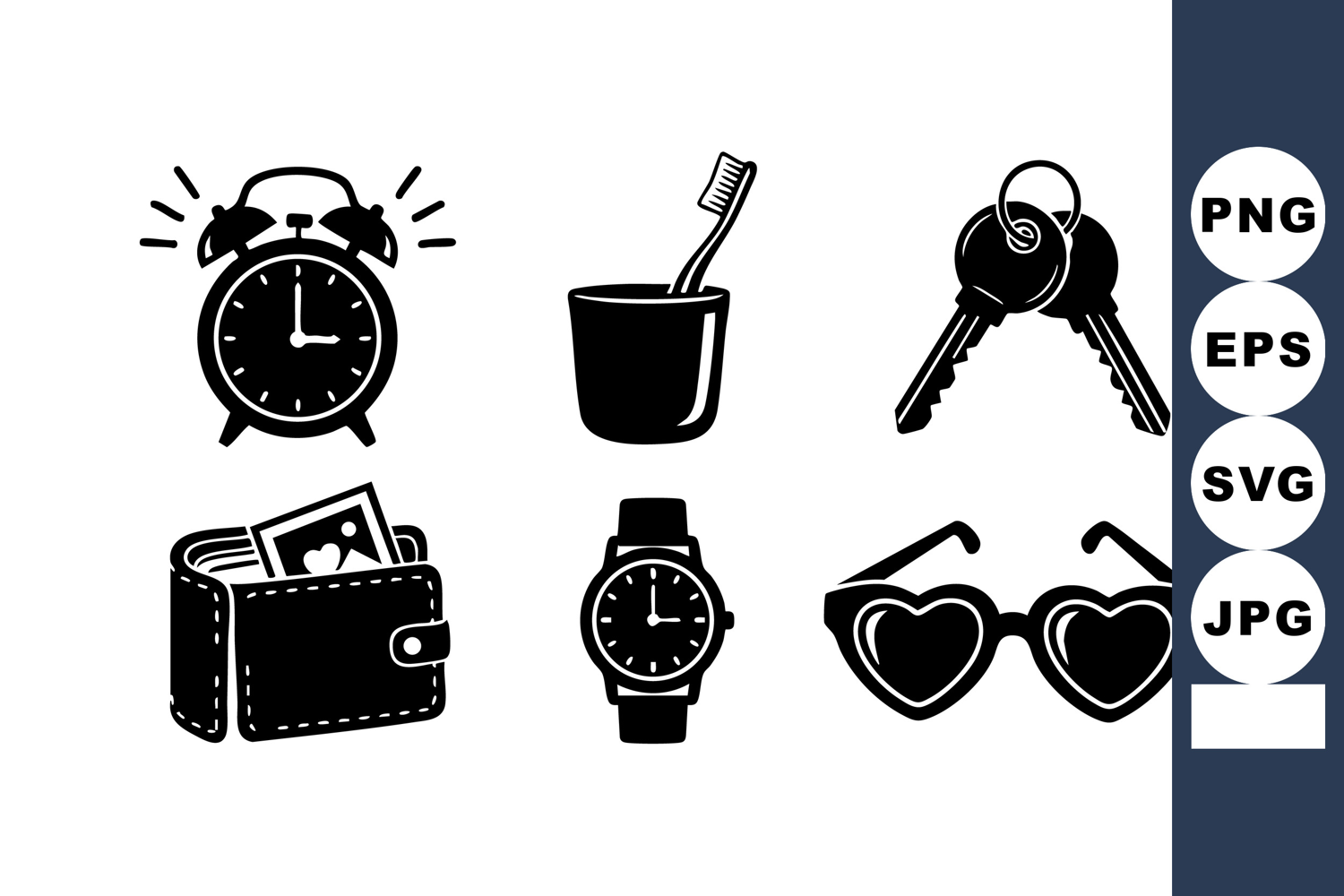This vector illustration shows black and white icons including an alarm clock, toothbrush in a cup, keys, wallet with photos, wristwatch, and heart shaped sunglasses. The style is simple and clean, conveying everyday essentials with clarity and charm. The mood is practical.