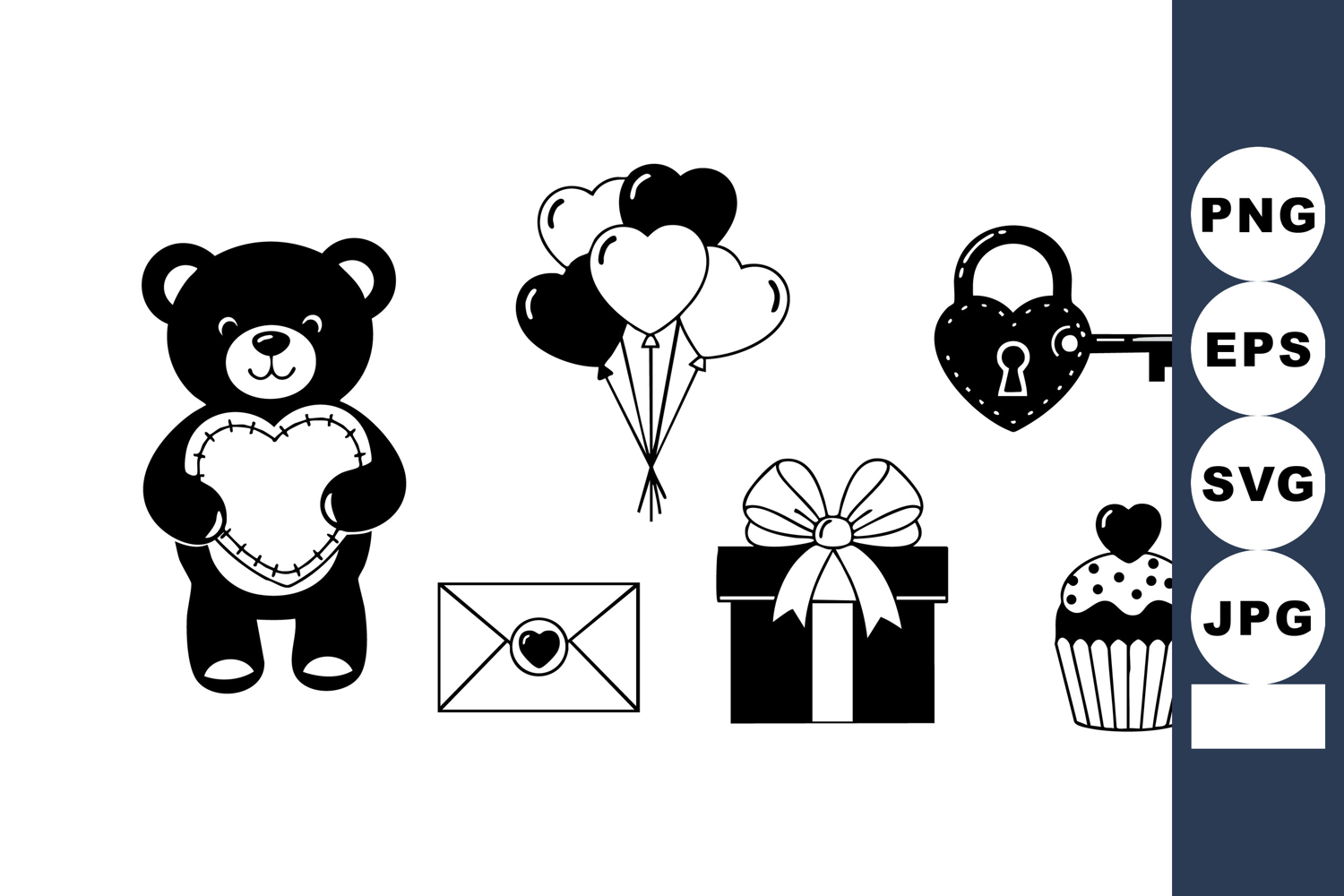 This vector illustration features a teddy bear holding a heart along with heart shaped balloons gift box envelope and a cupcake perfect for love and celebration themes cheerful