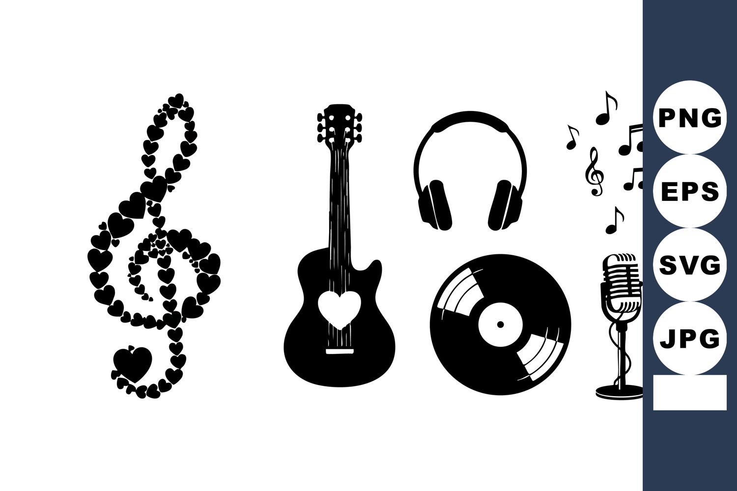 Black music symbols including treble clef made of hearts guitar with heart shape headphones vinyl record microphone and musical notes in simple style calm mood