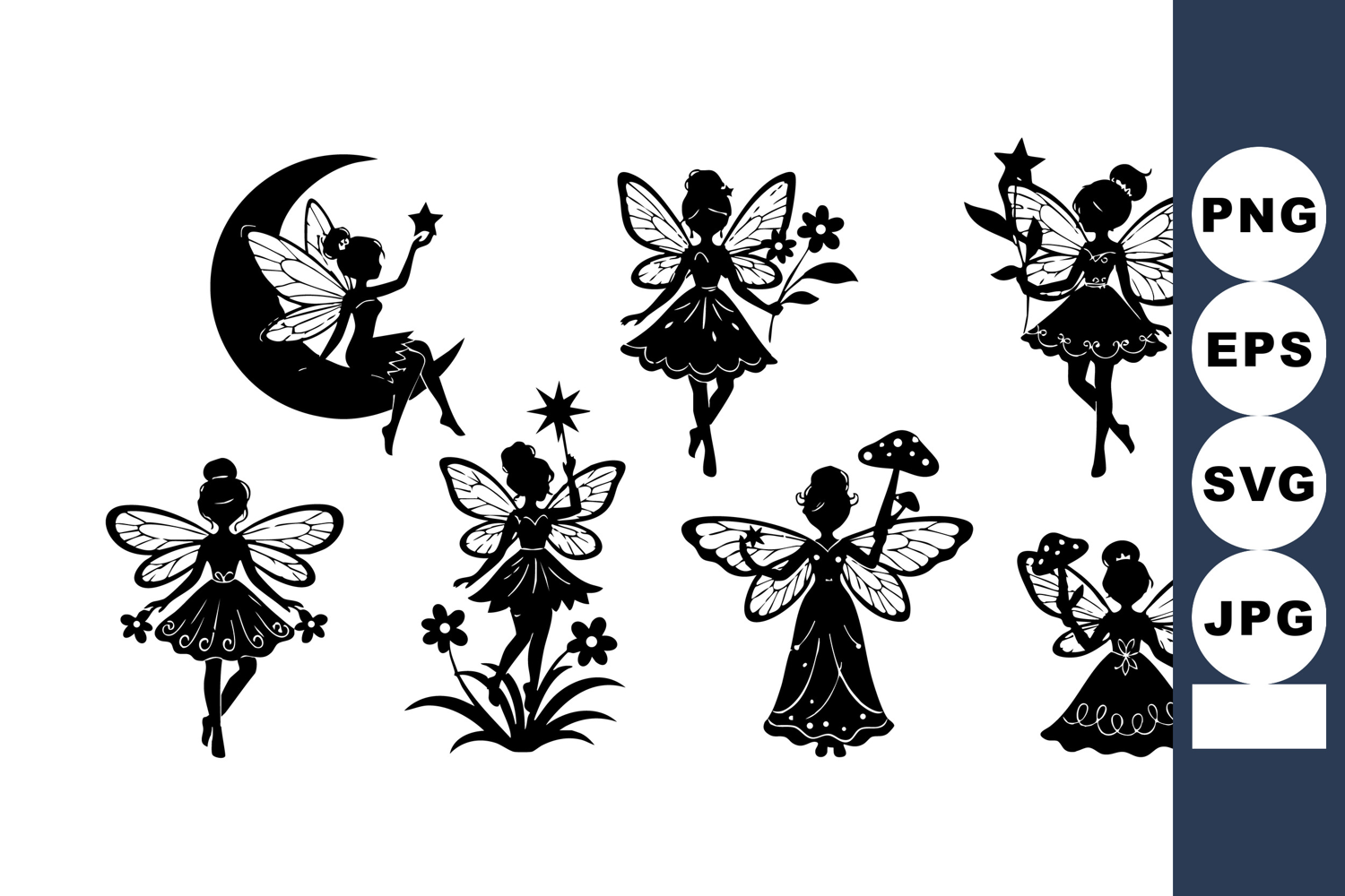 Collection of silhouette fairy vector illustrations featuring wings stars flowers mushrooms and moon shapes in black for magical fantasy themed design projects calm mood