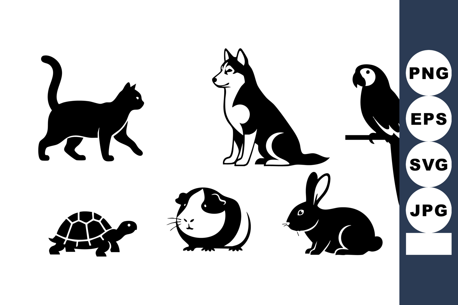This vector illustration shows silhouettes of common household pets including a cat, dog, parrot, turtle, guinea pig, and rabbit in a simple black style. Clean and minimal.