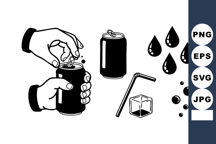 Black White Style Calm Mood Illustration Hand Opening Soda Soda Can Drink Can With Straw Ice Cube Water Water Drops Around Carbonated Beverage Can Simple Minimal Icon Cool Fresh Drink