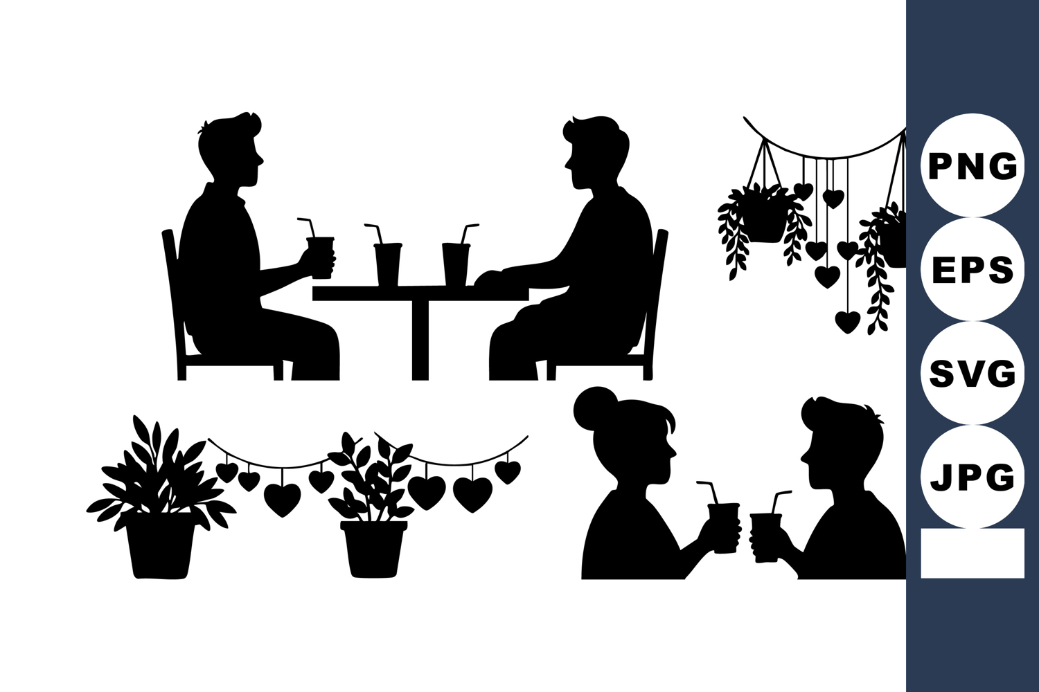 Silhouette People Drinking People Drinking Together Drinking At Table People Sitting Table Hanging Plants Decoration Heart Decorations Hanging Couple Drinking Beverage Friendly Mood Illustration Casual Social Gathering Relaxing Indoors Scene