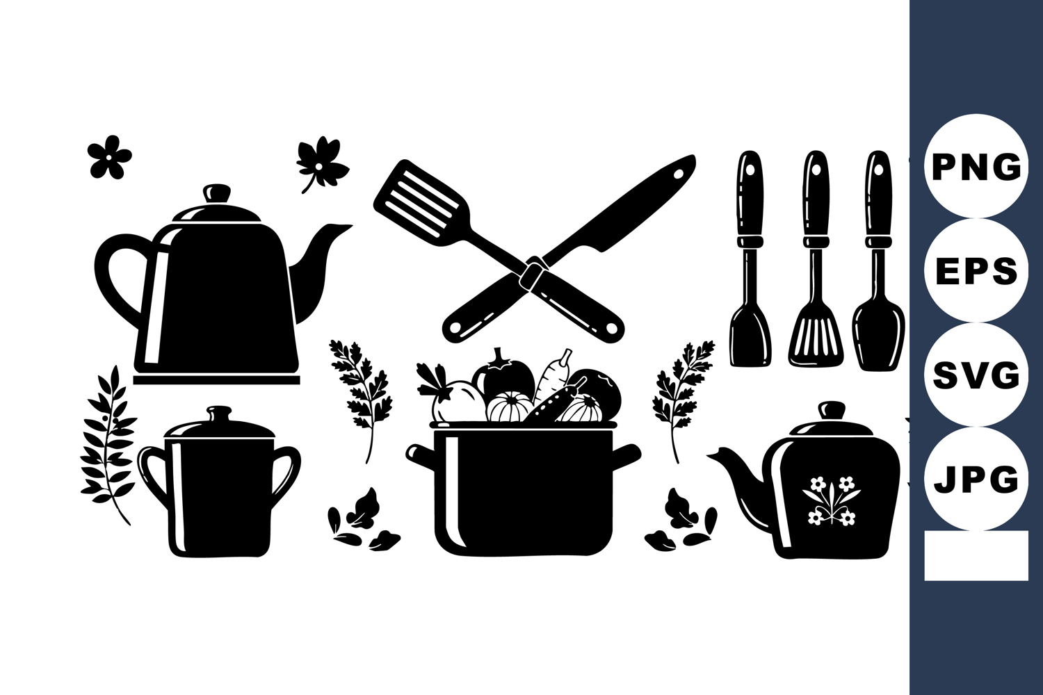 Silhouette Vector Illustration Kitchen Utensils Cooking Cooking Tools Teapot Teapot Spatula Knife Spatula Knife Brush Knife Brush Pot Brush Pot Leaves Pot Leaves Herbs Leaves Herbs Silhouette Herbs Silhouette Vector