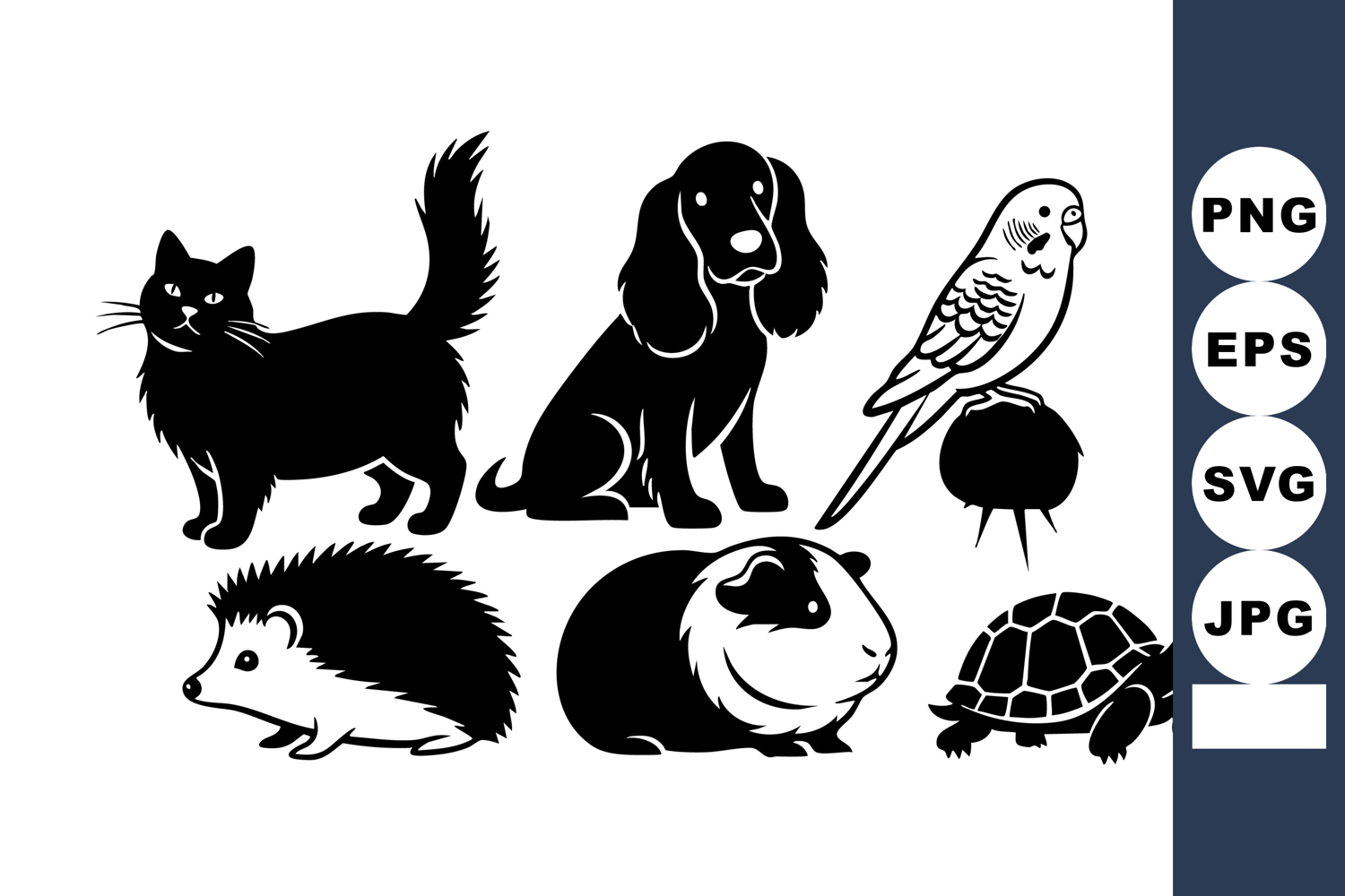 This vector illustration features black silhouettes of a cat, dog, bird, hedgehog, guinea pig, and turtle arranged in a simple composition. The style is minimal and clear, playful mood.