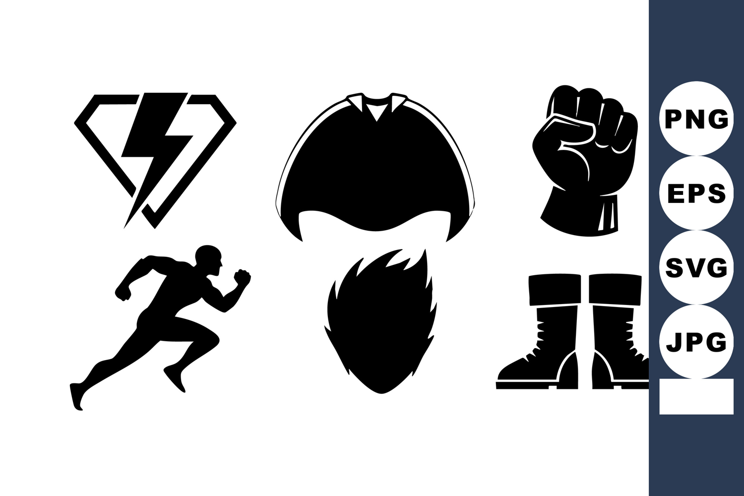 Running Man Vector Black Silhouette Icons Lightning Bolt Icon Fist Silhouette Vector Boots Silhouette Design Hair Silhouette Icon Cape Silhouette Graphic Minimalistic Icon Set Bold Silhouette Figure Dynamic Athletic Design