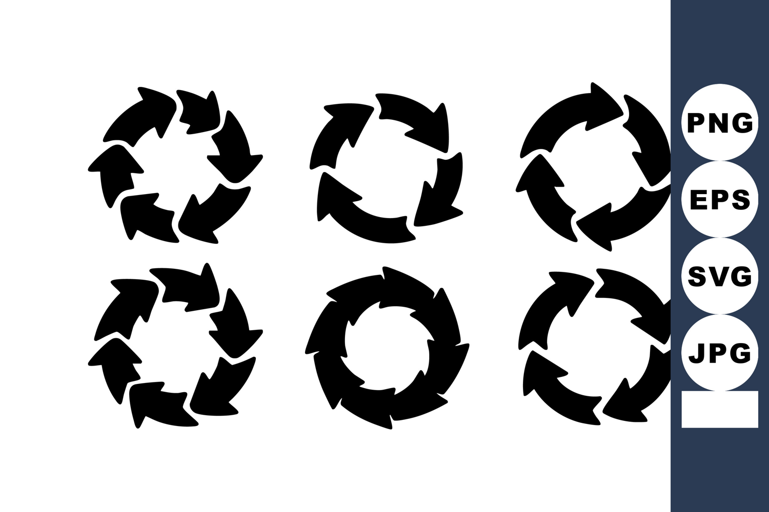 Vector image shows six circular arrow icons in black silhouette style representing recycling and continuous motion in simple design with bold shapes and smooth curves calm