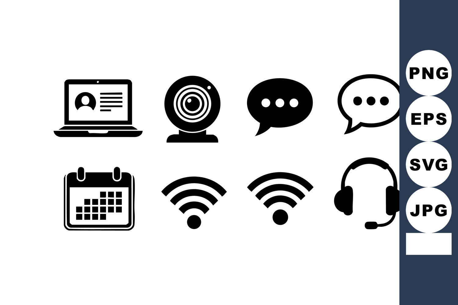 Vector icons showing communication technology including laptop, webcam, chat bubbles, calendar, wifi signals, and headset in black silhouette style. Modern digital theme. Clear and simple design. Neutral mood.