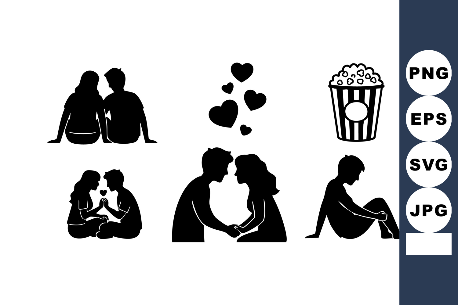 This vector illustration shows romantic couple silhouettes in different poses with love hearts and popcorn in black. The simple design conveys affection and leisure mood.
