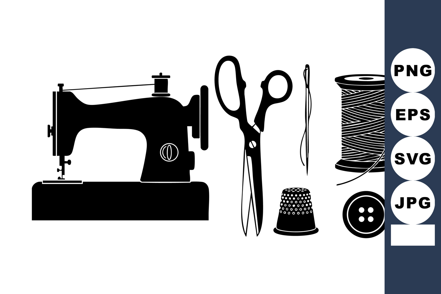 Black Silhouette Vector Sewing Machine Scissors Vector Illustration Sewing Handmade Sewing Craft Needle Spool Thimble Button Black Silhouette Sewing Tools Accessories Scissors Needle Spool Thimble Button Sewing Vintage Sewing Equipment