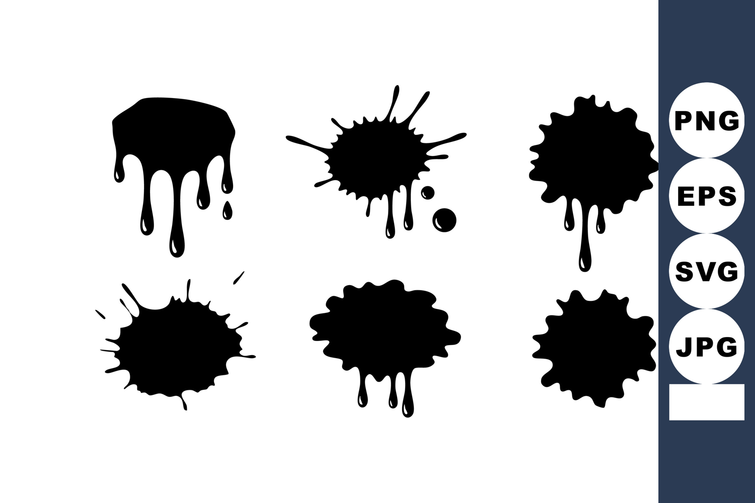 Vector illustration showing six different black ink splatters and drops in various shapes and sizes with dripping effects and splashes. Clean and bold design with artistic mood.