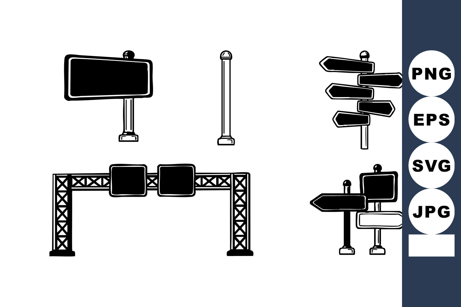 This vector illustration features various black and white road signs including directional arrows, blank boards, and poles designed for traffic guidance and navigation. Clear and minimalist style.