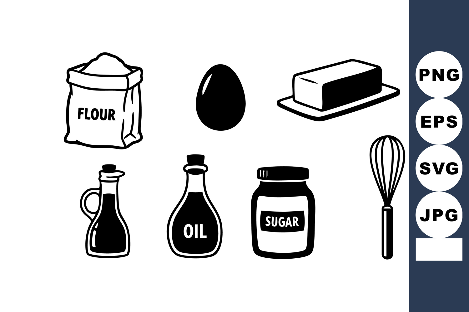 Simple black and white vector illustration of baking ingredients and kitchen tools including flour egg butter oil sugar and a whisk in clean style calm mood