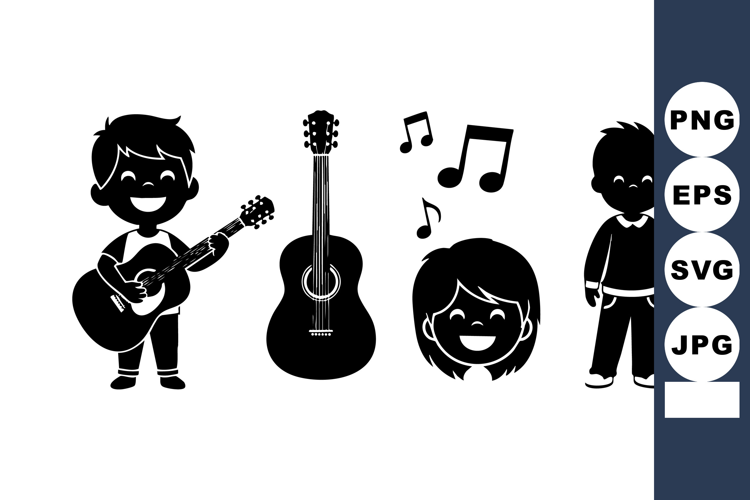 Vector illustration shows happy children playing guitar and singing with music notes around them in black silhouette style creating a joyful atmosphere cheerful mood
